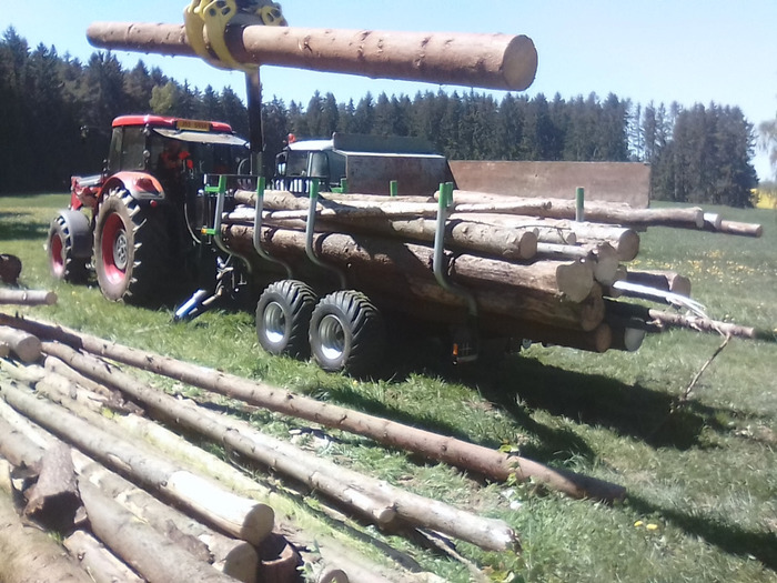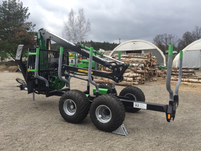 Holzrückewagen aus tschechischer Herstellung mit einer Tragfähigkeit von sechs Tonnen, mit Rückgratrahmen, Boogie-Achse, hydraulisch schwenkbarer Deichsel, mit Druckluftbremsen an einer Achse, mit verschiebbaren Rungen. Geeignet für die Holzbringung aus Waldbeständen.